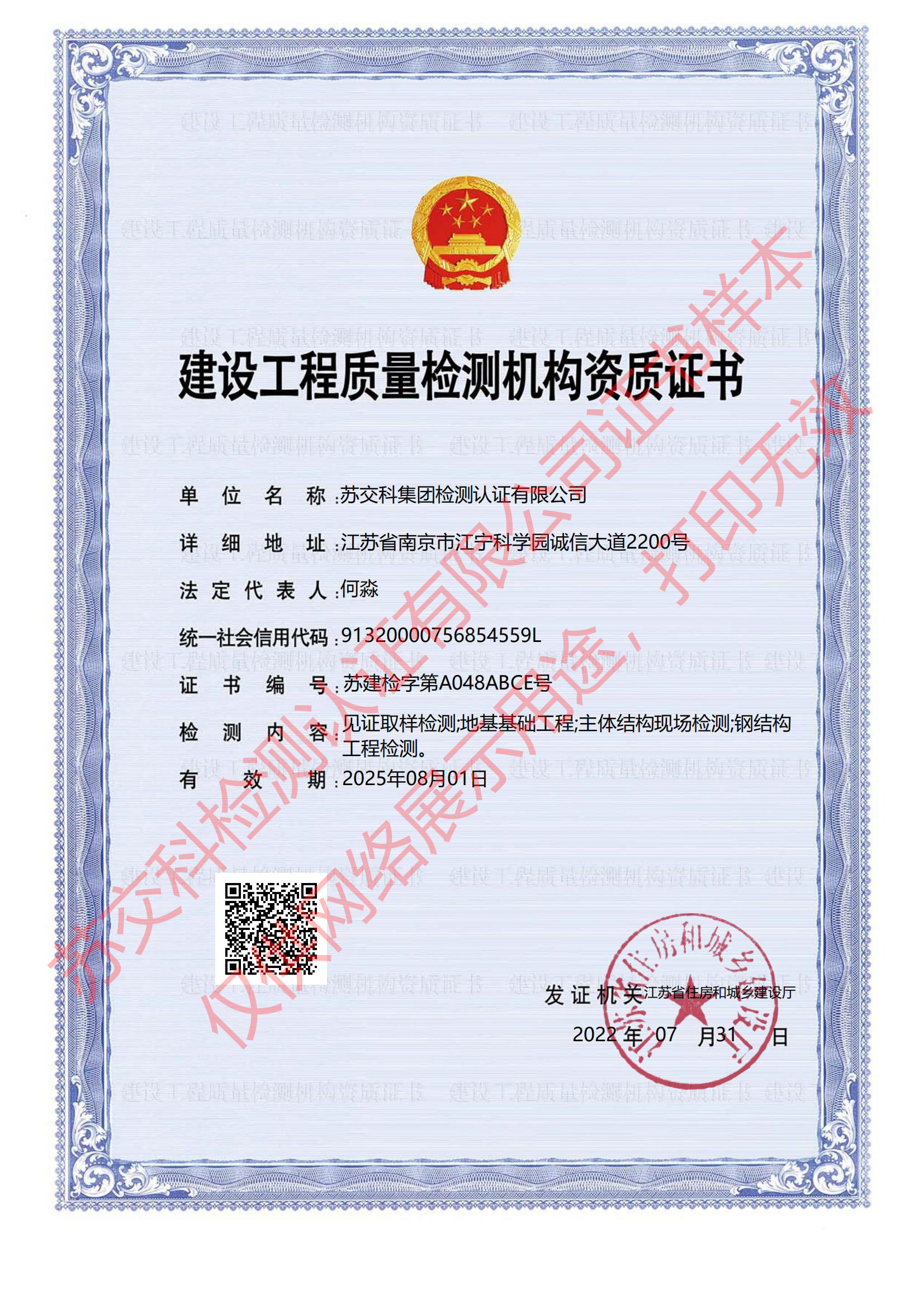 蘇交科檢測(cè)認(rèn)證建設(shè)工程質(zhì)量檢測(cè)機(jī)構(gòu)資質(zhì)證書(備案類)