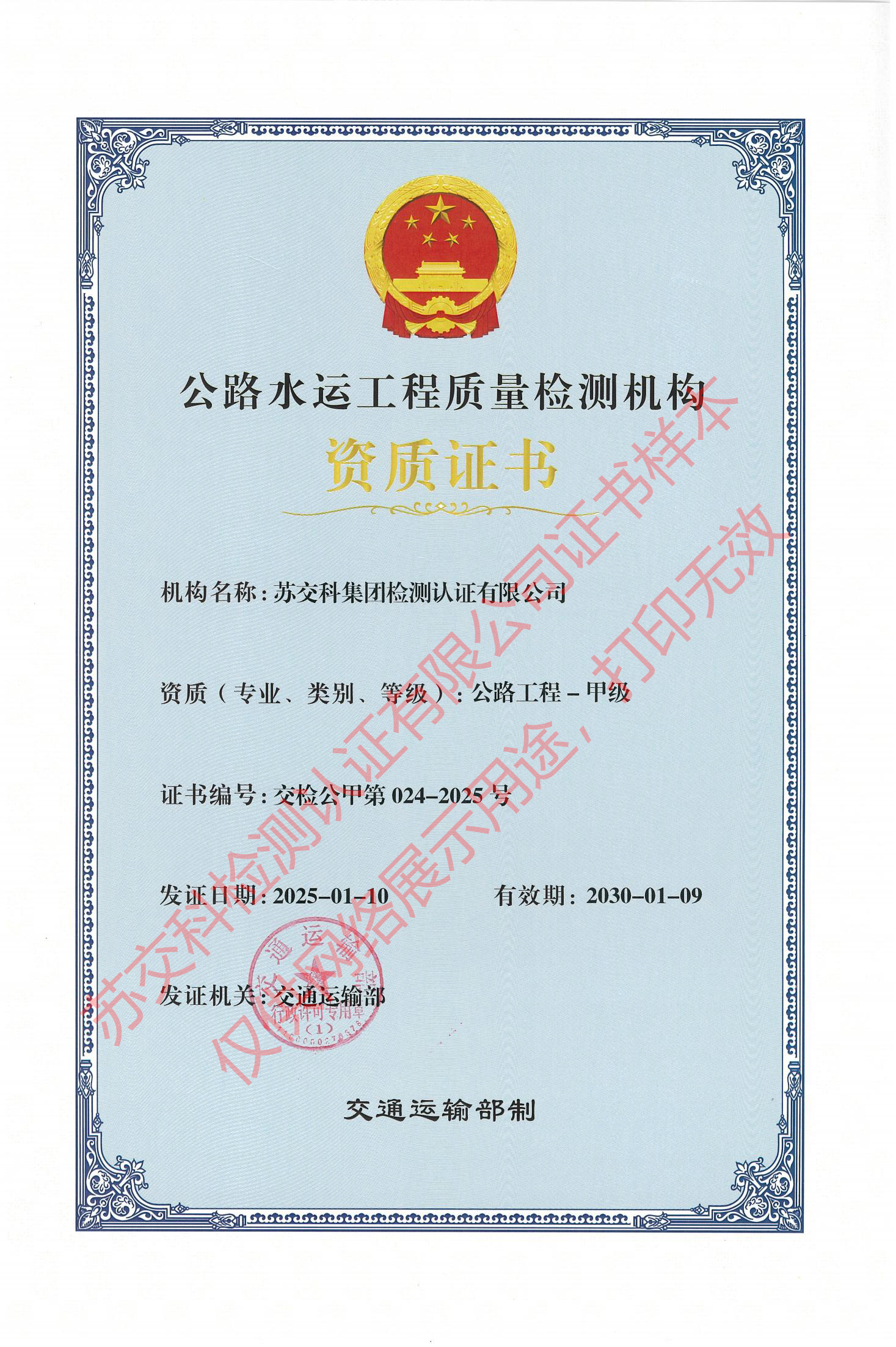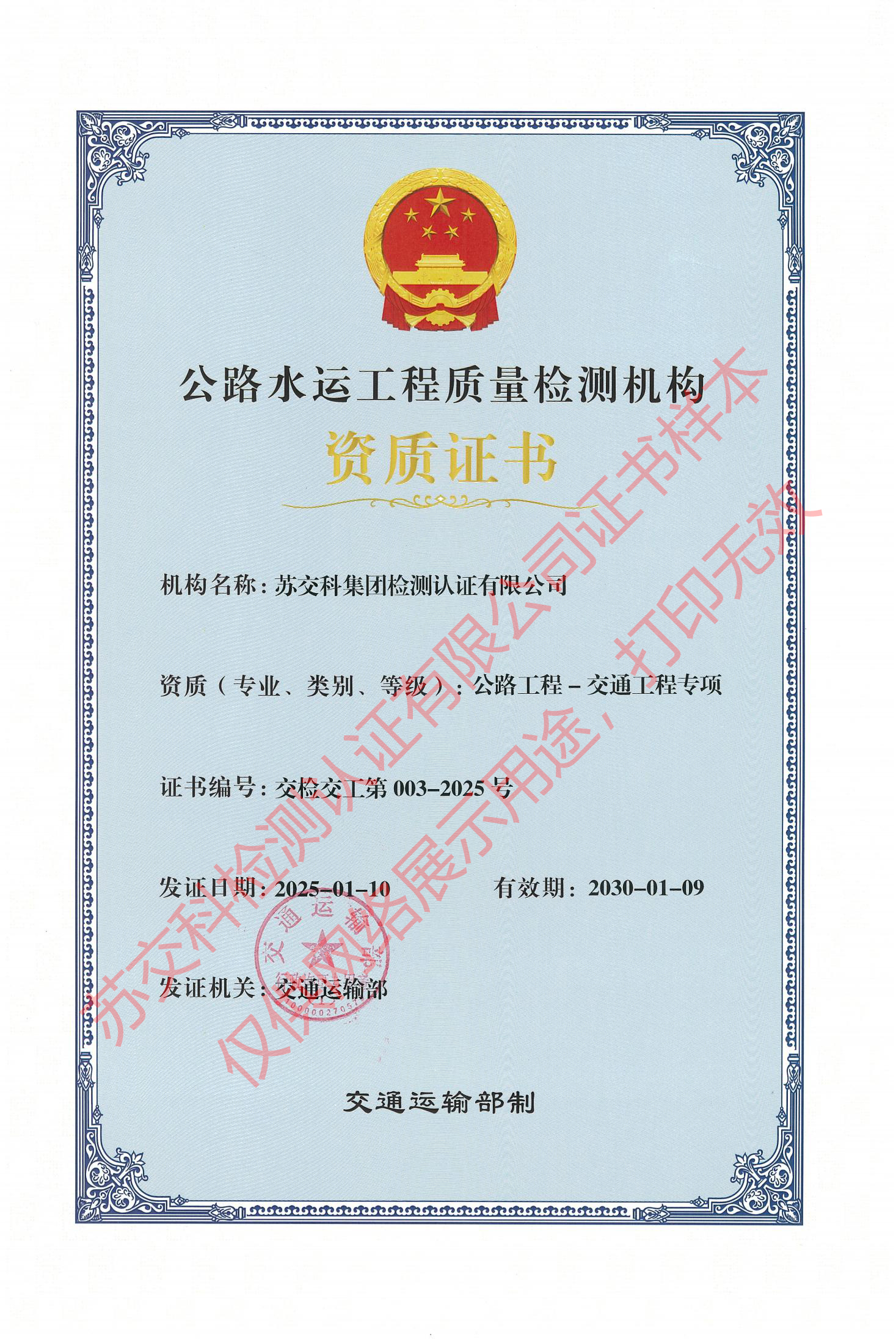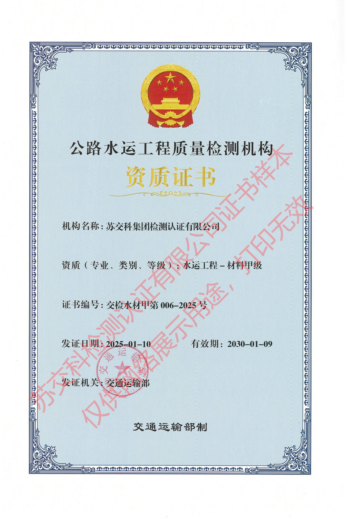 蘇交科檢測(cè)認(rèn)證水運(yùn)材料甲級(jí)